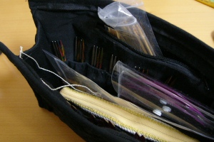 輪針は匠の4~8号60cmの。これはチャックでガバッと開くポーチにまとめて入れて。偶にしか使わないので、これでOK。