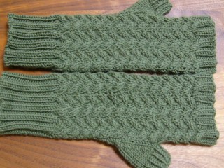 Aldermanは右上2目交差と左上2目交差が山盛り出てくるので、これを機に縄編み針無しでの交差目のやりかたを習得しよう!といろいろトライしてみました。
