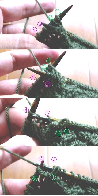 4枚目:落とした3・4目を右針にとり、1・2目を表編み2目する