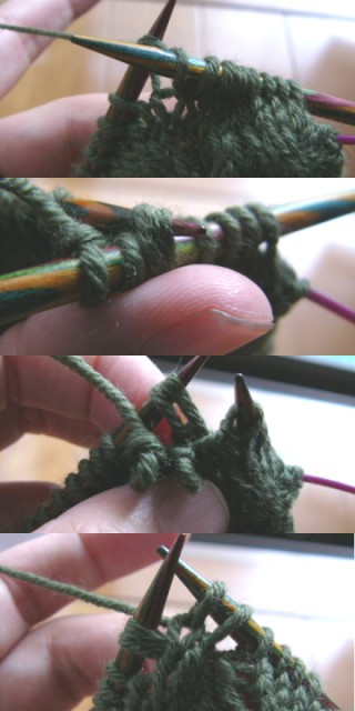 右上交差も滑り目を編んでからで入れかえる方が確実なんだけれど、工程数が多くなるので、強引に針を入れる方法に、