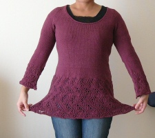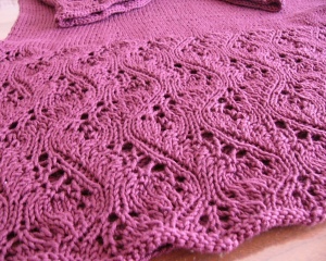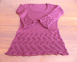 両袖を作ってから、裾のレースに戻って、Aラインになるように、模様を一回繰り返すごとに張りのサイズを1号上げて編みました。