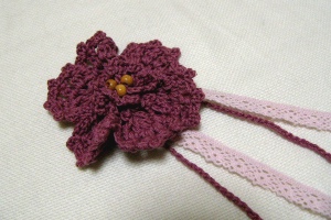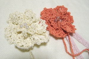 前回、質問している間に時間が空いたので、キエーティーの残り糸でコサージュを作りました。ピンク~黄色の段染めが活かされた花びらになったので満足v
